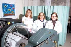 Tulsa Wound Care and Hyperbaric Center staff pictured with a hyperbaric chamber: (L to R) Lori Ormsby, Director of the Wound Program; Kathy Kelley, HBO Supervisor; and Tricia Sheehy, Manager.